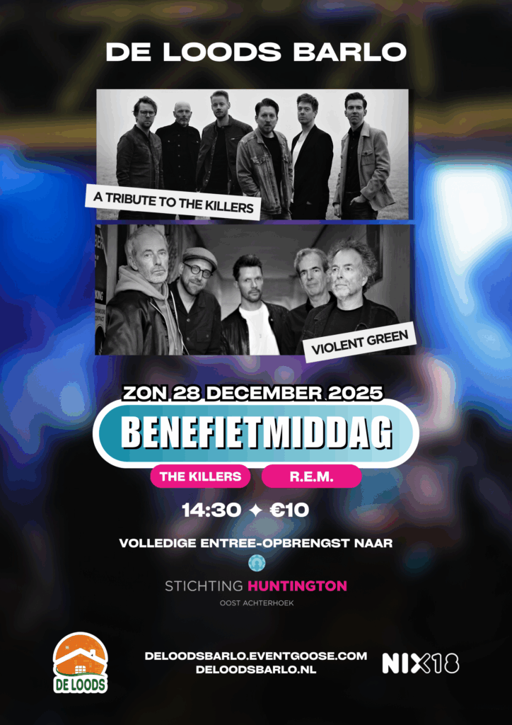 Op zondagmiddag 28 december 2025 staan er twee fantastische tribute-acts op het podium van De Loods Barlo! 🎶✨ Tijdens deze benefietmiddag brengt A Tribute to The Killers de energieke opzwepende hits van de band uit Las Vegas naar Barlo, terwijl Violent Green je meeneemt in de prachtige albums van R.E.M. 🎸