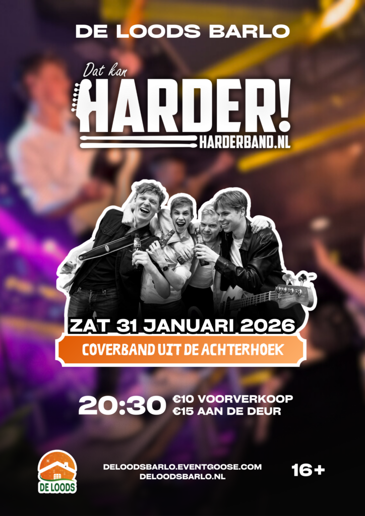 Op zaterdag 31 januari 2026 komt HARDER! naar De Loods Barlo 🪩 Tickets zijn vanaf nu voor €10 (excl. €1 servicekosten) verkrijgbaar via deloodsbarlo.eventgoose.com 🎟️ De minimumleeftijd is 16+